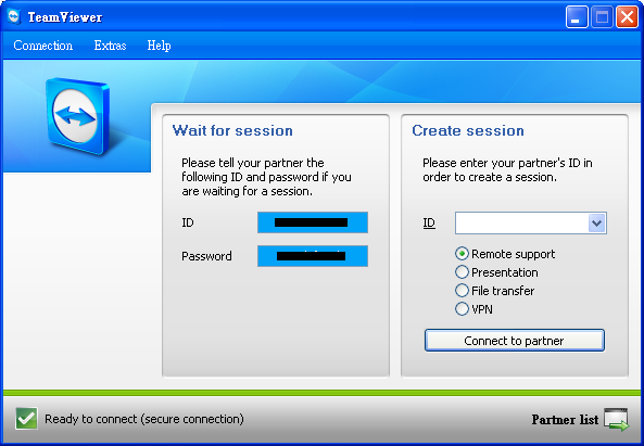 2. 將上一步得到的 ID 及 密碼告知對方後, 對方也一樣啟動 TeamViewer 並輸入您的 ID 和密碼就可以連線至您桌面了.